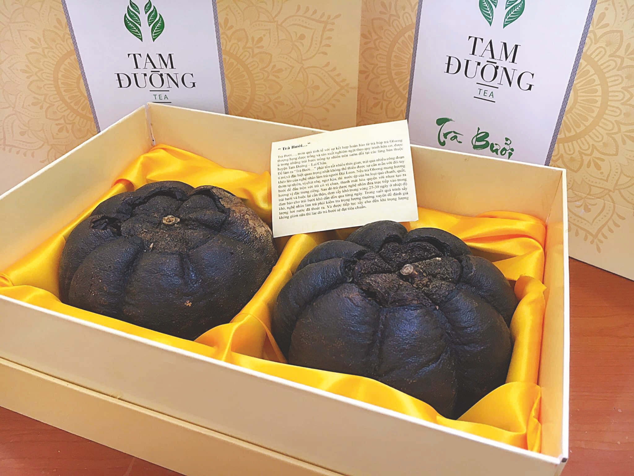 Thành phần nguyên liệu: Trà oloong hữu cơ, trái bưởi, nước ép chanh, quất, bưởi. Trà Bưởi là món quà tinh tế với sự kết hợp hoàn hảo của trà Olong mang hương thơm tự nhiên, vị chát nhẹ, ngọt hậu và nước ép của ba loại quả chanh, quất, bưởi có vị chua, thanh mát hòa trộn với nhau (trước khi cho trà vào trái bưởi) để tạo ra hương vị đặc trưng riêng.