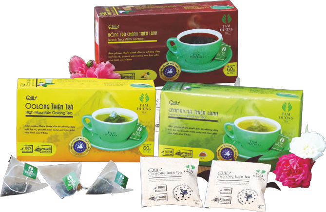 Trà Oolong thiện trà, Genmaicha Thiện Lành, Hồng trà chanh thiện trà. Nguyện liệu: Chè kim tuyên nguyên chất được đóng túi pyramid và sản xuất theo tiêu chuẩn Châu Âu, tiện lợi, đẹp mắt và sang trọng.